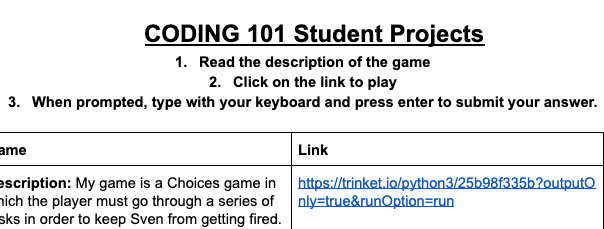The flagship of my Digital Literacy program was Coding 101. Once a week for 10 weeks after school, students would learn a new concept in Python and apply it to their culminating project: a text based choose your own adventure game. Students were able to come up with simple games like a guacamole maker as well as more complex games like a civilization simulator. Project-based learning really worked in this program as students were always motivated to learn more and add to their game.